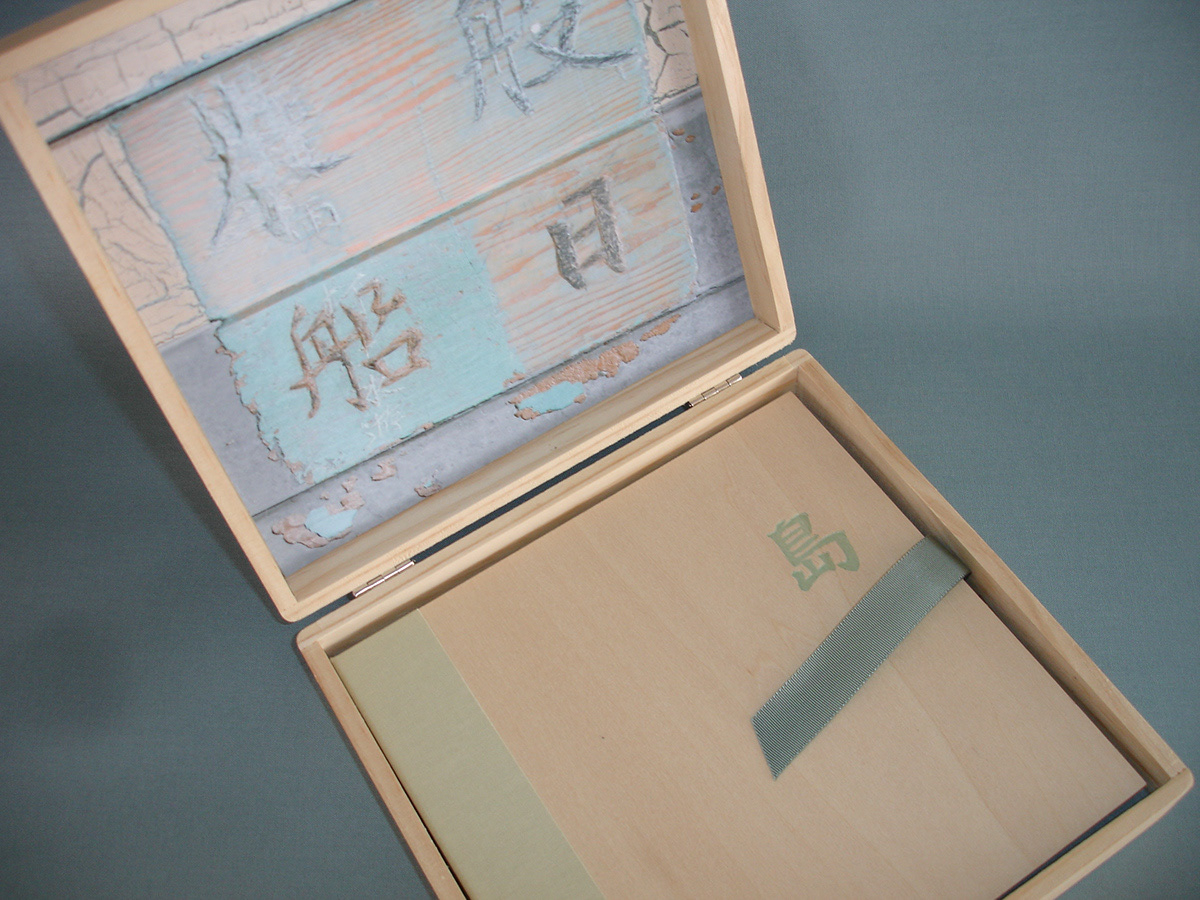 Letterpress printed poems, Japanese stab binding with wood covers in etched wood box
